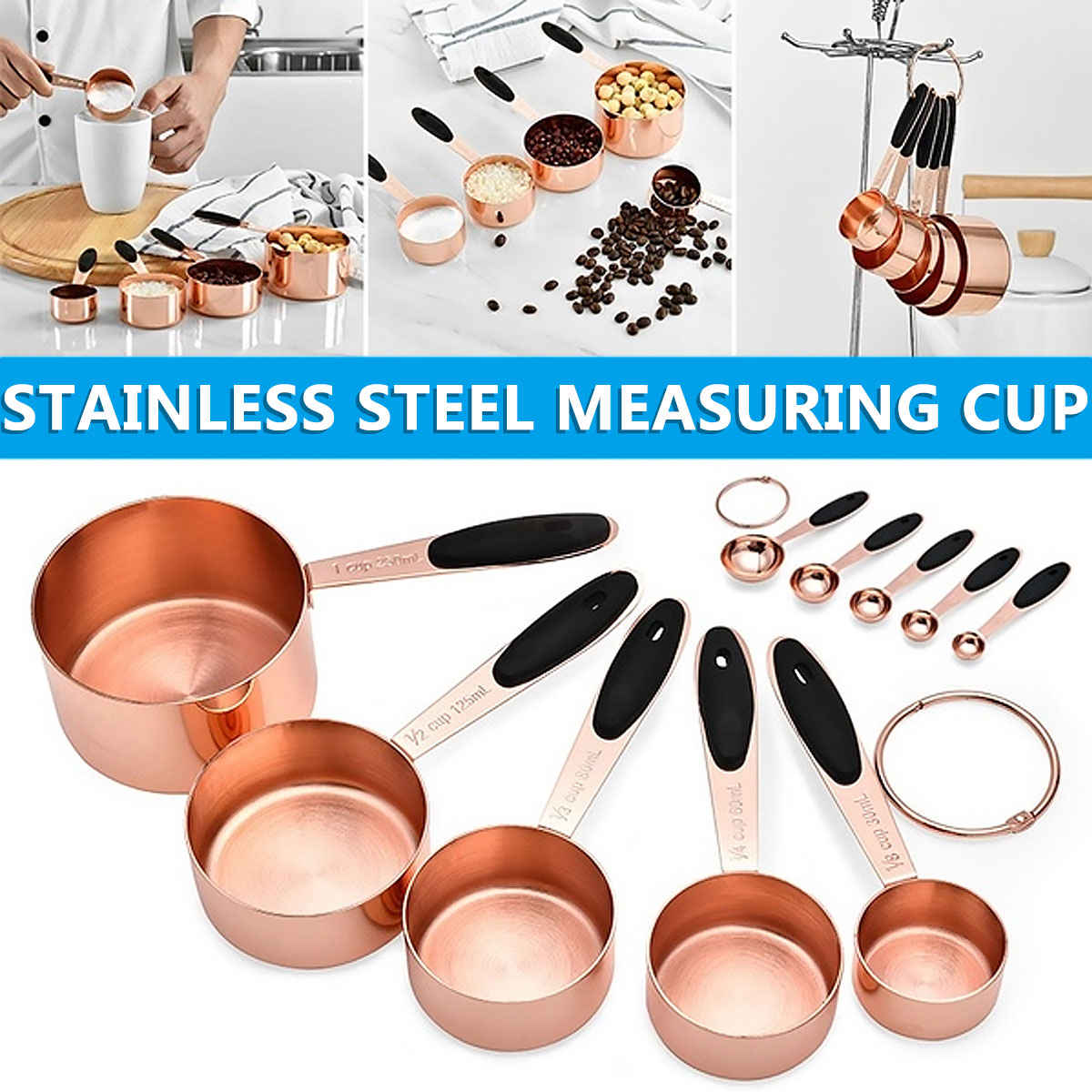 - KITCHEN MEASURING SET: This set of 5 measuring cups or 5 measuring spoon are made of stainless steel with copper coating, rust resistant, corrosion resistant and shatter-proof.