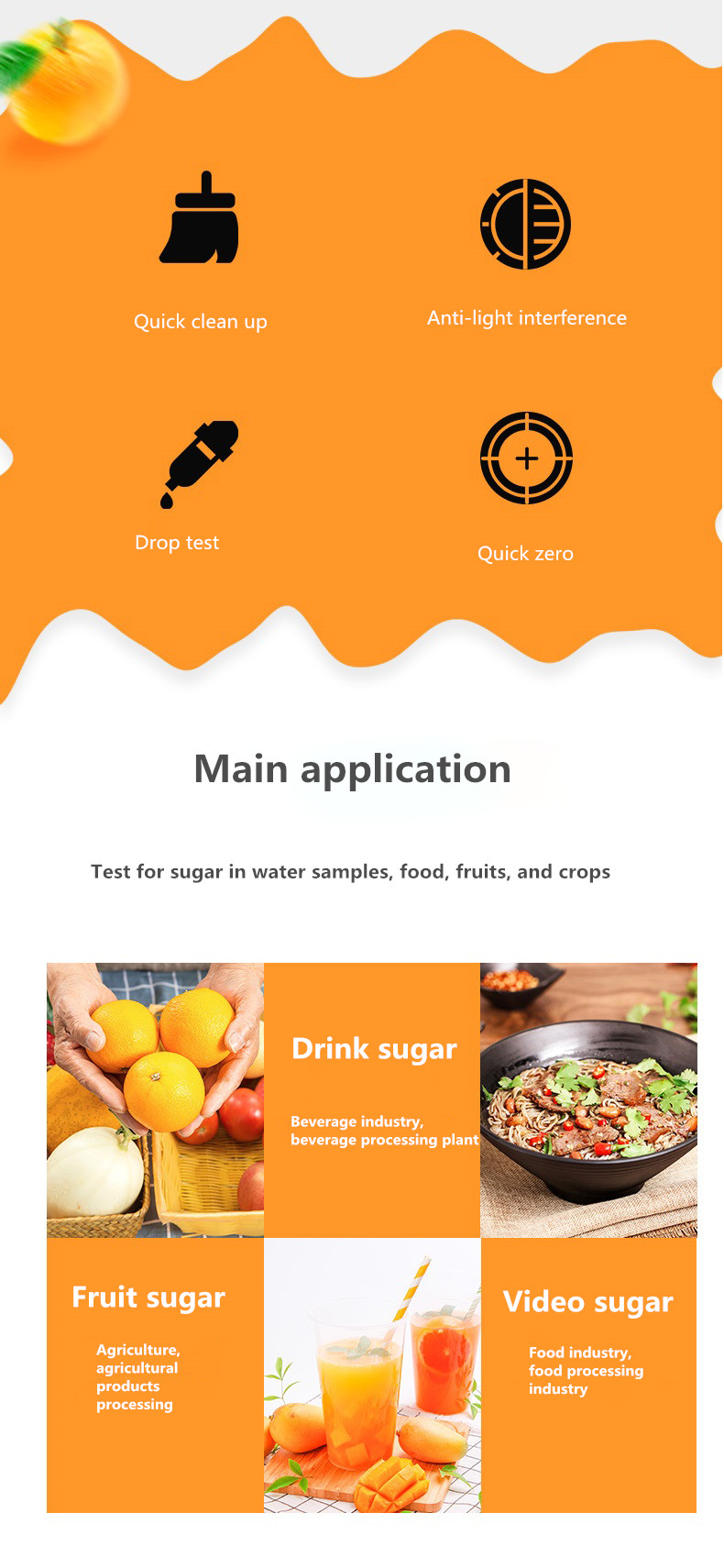 • This instrument uses optical principles to professionally measure the sugar content in water samples, food, fruits, and crops.
