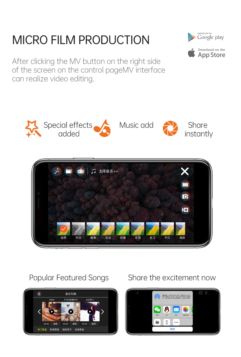 - MV functions: filters, video effects, add background music, picture / video sharing
