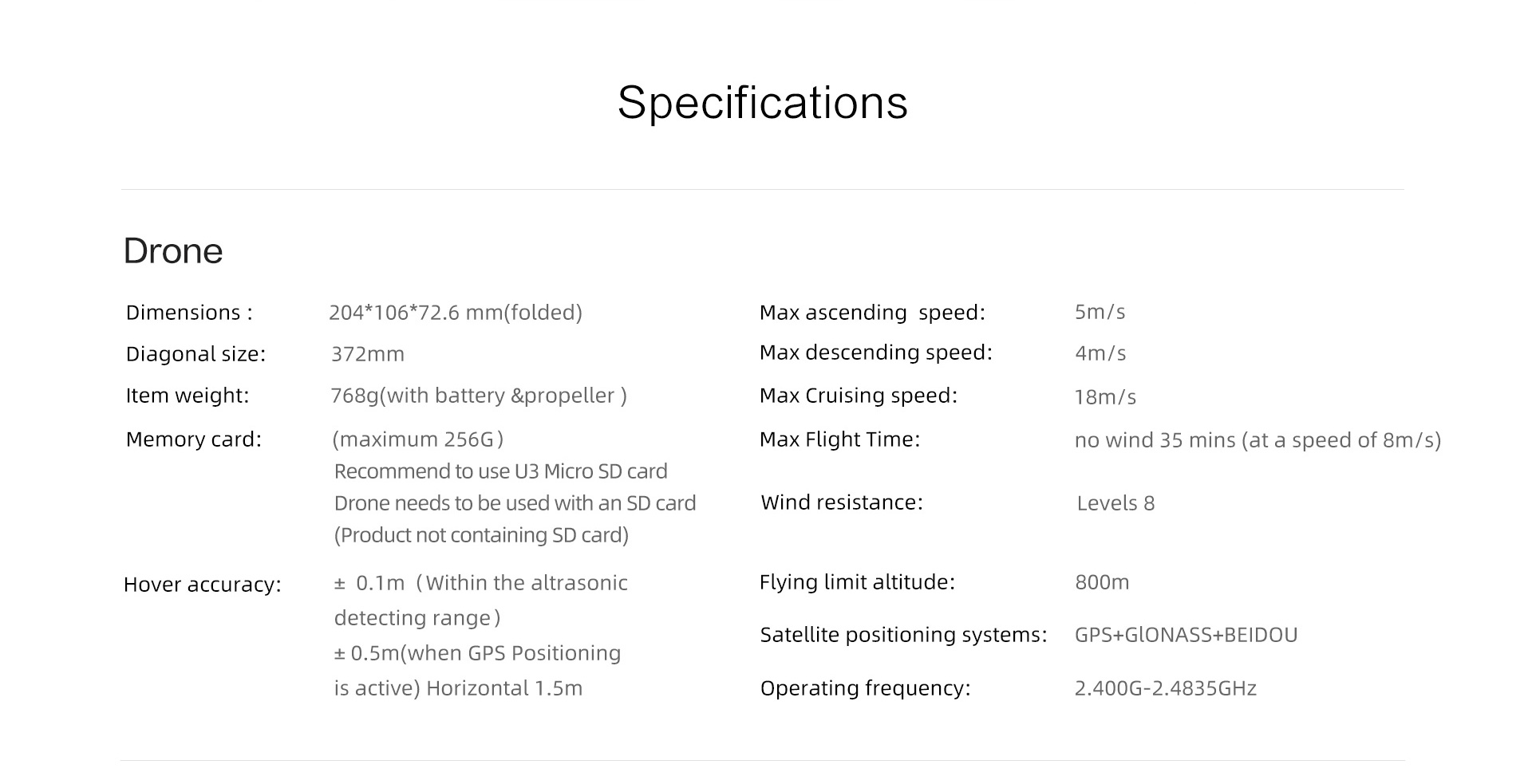 | Drone | Dimensions: 204 x 106 x 72.6mm(folded) Diagonal size: 372mm Item weight: 765g(with battery&propeller) Color: White Hover accuracy: ±0.1m (Within the ultrasonic detecting range) ±5m (when GPS Positioning is active) Horizontal: ±1.5m Max ascending speed: 5m/s Max descending speed: 4m/s Max cruising speed: 18m/s Maximum Flight Time (no wind): About 35mins (at 8m/s constant speed) Wind resistance: Levels 8 Flying limit altitude: 800m Satellite positioning systems: GPS+GLONASS+BEIDUO Operating frequency: 2.400G-2.4835 GHz System: 3rd gen RokLink Latency: 130ms min Rain proof: Moderate rain RemoteID Compatibility: Yes(built-in) | Dimensions: 204 x 106 x 72.6mm(folded) Diagonal size: 372mm Item weight: 765g(with battery&propeller) Color: White Hover accuracy: ±0.1m (Within the ultrasonic detecting range) ±5m (when GPS Positioning is active) Horizontal: ±1.5m Max ascending speed: 5m/s Max descending speed: 4m/s Max cruising speed: 18m/s Maximum Flight Time (no wind): About 35mins (at 8m/s constant speed) Wind resistance: Level 5 Flying limit altitude: 500m Satellite positioning systems: GPS+GLONASS+BEIDUO Operating frequency: 5.725-5.850 GHz System: 2nd gen TDMA system Latency: 220ms min Rain proof: Light rain RemoteID Compatibility: No(need extra plug-in module) |
