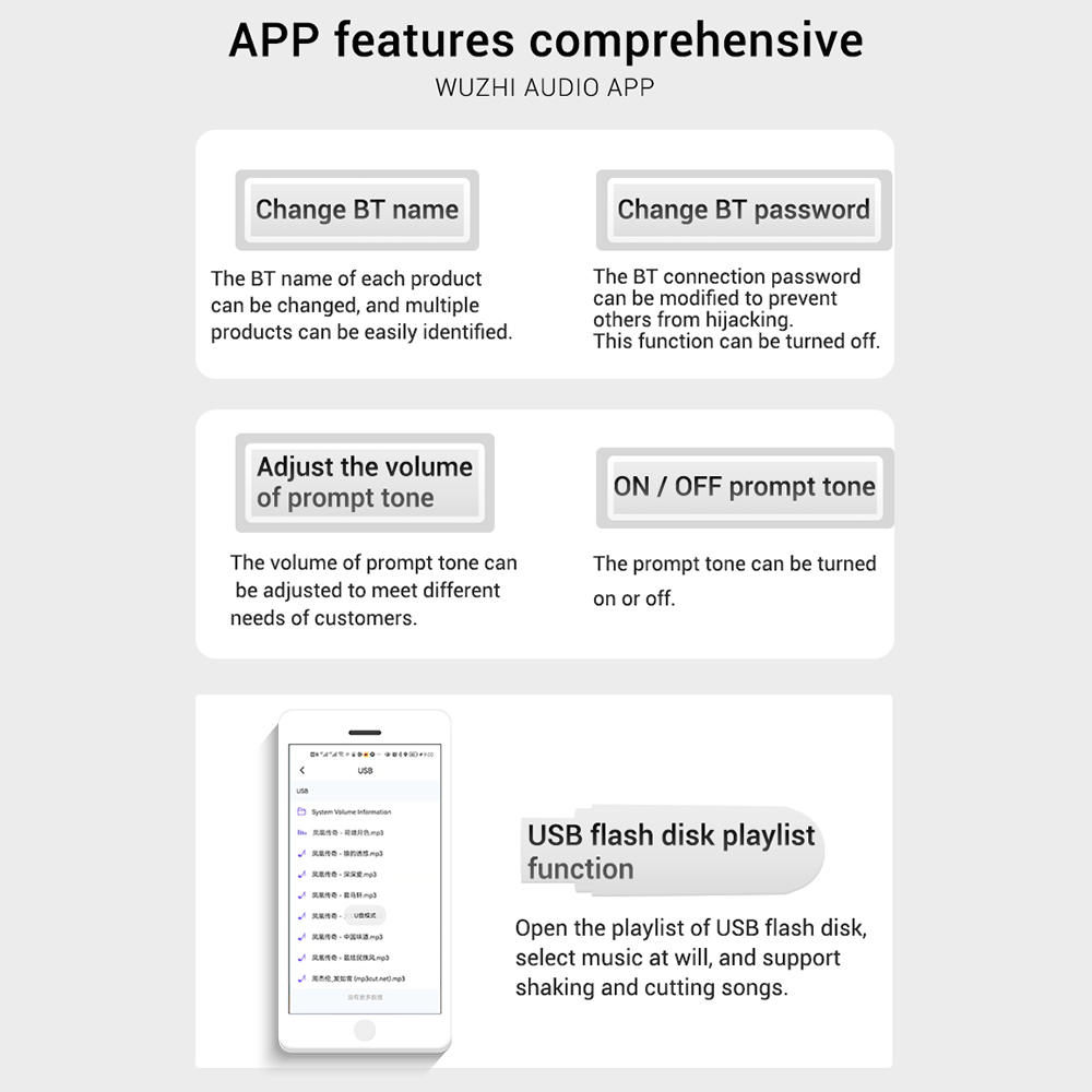 Support Wuzhi Audio APP. Modify and change the bluetooth name, password setting, volume adjustment of prompt sound, on/off prompt sound, sleep aid, sound effect selection + custom sound effect, U disk playlist.